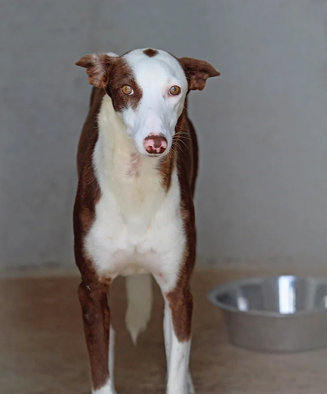UPDATE: Janus was taken to the Solera home to join Tina’s pack for a bit and what a difference! It just further confirms to us how much these dogs need to be in homes. The GDS kennels can be too much for some dogs. While still shy, she joins in with the other dogs on the couch and is very interested in everything is going in the home. She explores the house and is easily approached by Tina. We are confident that in an experienced home with confident dogs, Janus will bloom.