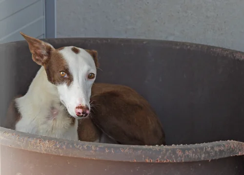 Janus was found living rough very close to a roadway with her companion Patricia and Patricia's five pups. She is extremely terrified and presently using her safety place within her kennel to feel secure. For months we thought Janus was a boy as she would not let anyone near her. She now goes out into the exercise area with her roommates and enjoys romping with them.